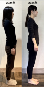 彼女が初来店くださったのは写真左側の2021年です。本人は真面目に、真っ直ぐ立って頂いている状態です。そして写真右側は、2024年の彼女です。3年前と同じように真っ直ぐ立って頂いている状態です。