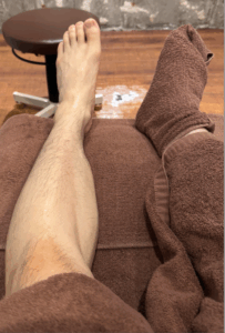 脚が冷えないように保温しながら、片脚ずつの施術になります。”深押し”という特許の技術で約20分かけて片脚を、指先から膝裏まで行って頂きました。左足がむくみも流れて、すっきりしてます。