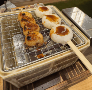 自分たちで焼くスタイルの提供で、何もついていないお餅を焼いてタレをつけて頂く手順になります。