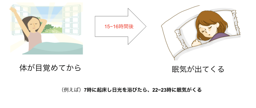 正しくセロトニンが働いていれば、体が目覚めてから、15−16時間後に眠気が出ます。例えば、