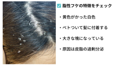 頭皮の過剰な皮脂分泌によって引き起こされる頭垢です。頭垢が黄色く油っぽく見えることが特徴です。オイリーフケは、マラセチア菌の過剰な増殖や炎症の影響を受けることがあります。